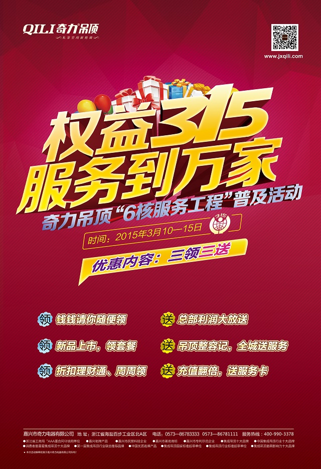 2015年3月15日,奇力吊頂,集成吊頂行業(yè)客廳吊頂領(lǐng)導者,暖風電器領(lǐng)導者,國家與行業(yè)標準起草單位,在消費者權(quán)益保護日這年度最重要的日子里,旗幟鮮明的推出了全國聯(lián)動的“權(quán)益315 服務(wù)到萬家——奇力吊頂“6核服務(wù)工程”普及活動,領(lǐng)袖,必定承擔超越同行的責任!