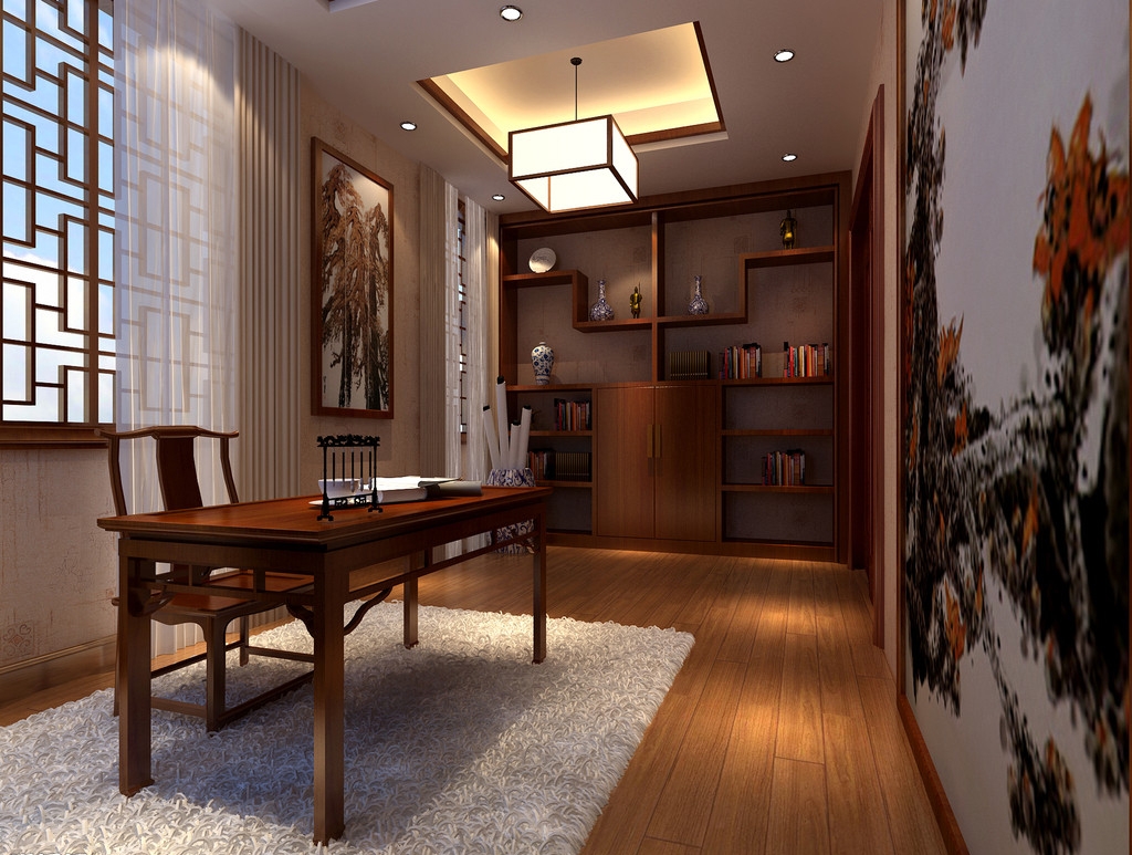 中式風(fēng)格的書房,符合典雅、樸實(shí)、具有傳統(tǒng)意義上的“書齋”的韻味?!八故锹?,唯吾獨(dú)馨”就是中式風(fēng)格書房的完美演繹。紅色仿木紋樣式的吊頂,置入中式家具,加上中式書柜、茶幾及屏風(fēng),配以中國(guó)字畫和古玩等點(diǎn)綴其間,就構(gòu)成一幅中式風(fēng)格的書房藍(lán)圖。進(jìn)入這個(gè)書房學(xué)習(xí),你是不是也會(huì)有種穿越的感覺。